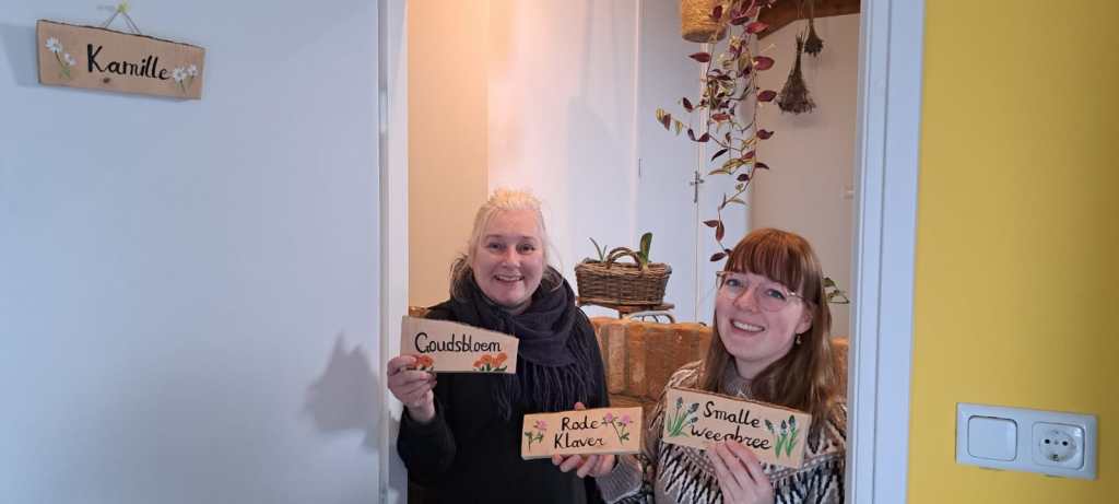 Speciaal voor Karin’s kruidenhoeve heeft Amber Endhoven prachtige naambordjes met de hand gemaakt. Ze heeft naast de naam, ook de betreffende bloem erop geschilderd. Gisteren hebben we de laatste, Goudsbloem, opgehangen. Wij zijn er erg blij mee.